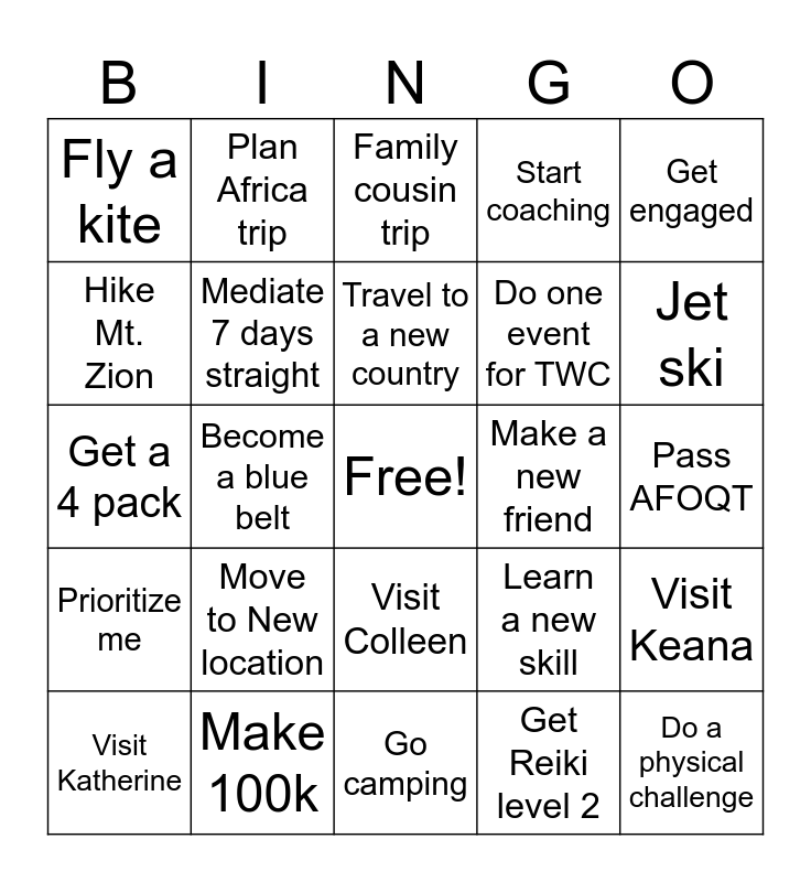 This bingo card has a free space and 24 words: Move to New location, Make 100k, Travel to a new country, Visit Katherine, Get engaged, Fly a kite, Hike Mt. Zion, Plan Africa trip, Make a new friend, Visit Colleen, Do one event for TWC, Get a 4 pack, Learn a new skill, Visit Keana, Mediate 7 days straight, Get Reiki level 2, Pass AFOQT, Family cousin trip, Jet ski, Become a blue belt, Do a physical challenge, Prioritize me, Start coaching and Go camping.