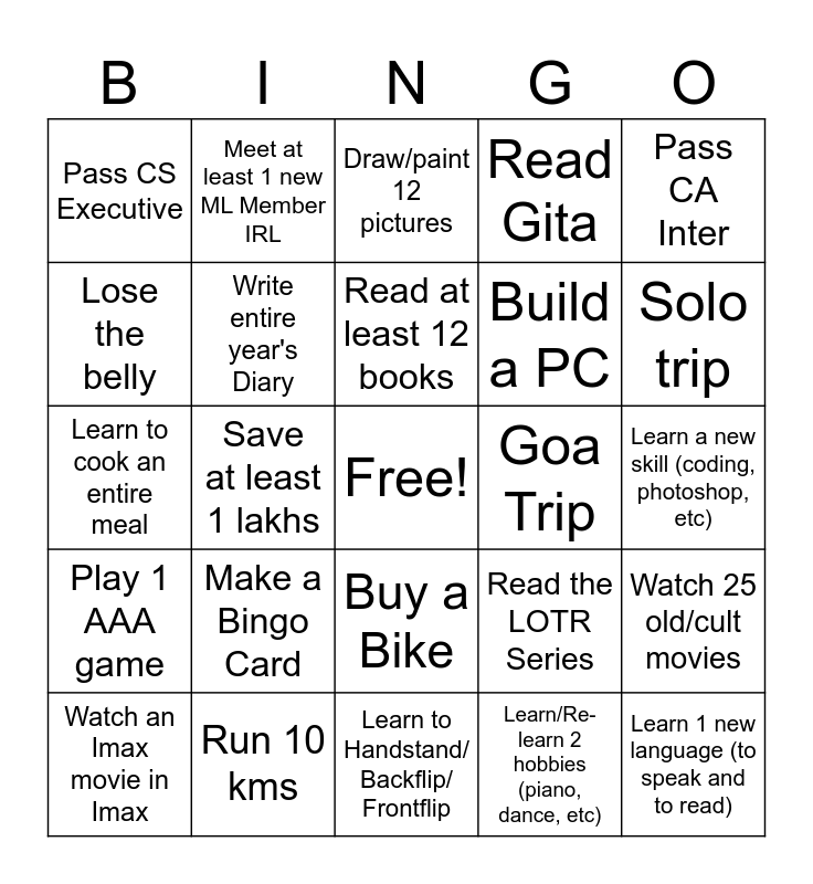 This bingo card has a free space and 24 words: Make a Bingo Card, Run 10 kms, Read at least 12 books, Watch an Imax movie in Imax, Pass CA Inter, Pass CS Executive, Lose the belly, Meet at least 1 new ML Member IRL, Goa Trip, Buy a Bike, Build a PC, Learn to cook an entire meal, Read the LOTR Series, Watch 25 old/cult movies, Write entire year's Diary, Learn/Re-learn 2 hobbies (piano, dance, etc), Learn a new skill (coding, photoshop, etc), Draw/paint 12 pictures, Solo trip, Save at least 1 lakhs, Learn 1 new language (to speak and to read), Play 1 AAA game, Read Gita and Learn to Handstand/ Backflip/ Frontflip.
