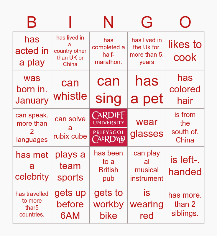 This bingo card has a free space and 24 words: plays a team sports, gets up before 6AM, can sing, has travelled to more thar5 countries., likes to cook, has acted in a play, was born in. January, has lived in a. country other than UK or China, wear glasses, has been to a British pub, has a pet, can speak. more than 2 languages, can play al musical instrument, is left-. handed, can whistle, is wearing red, is from the south of. China, has completed a half- marathon., has colored hair, can solve a rubix cube, has more. than 2 siblings., has met a celebrity, has lived in the Uk for. more than 5. years and gets to workby bike.