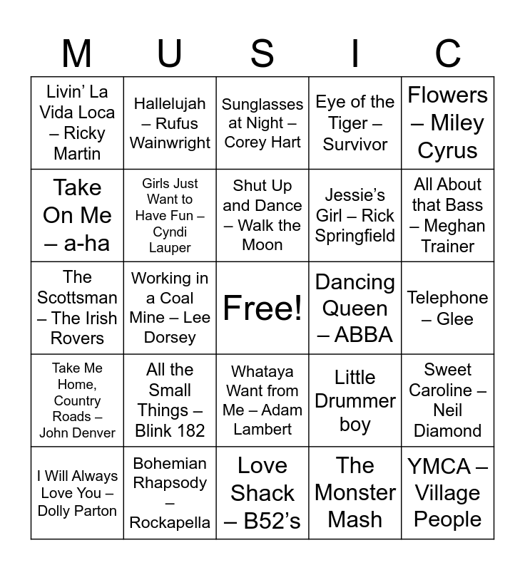 This bingo card has a free space and 62 words: Hotel California – Eagles, Bohemian Rhapsody – Rockapella, Piano Man – Billy Joel, Take Me Home, Country Roads – John Denver, Stairway to Heaven – Led Zeppelin, Brown Eyed Girl – Van Morrison, Girls Just Want to Have Fun – Cyndi Lauper, Billy Jean – Michael Jackson, Jessie’s Girl – Rick Springfield, Come On Eileen – Dexys Midnight Runners, Eye of the Tiger – Survivor, Footloose – Kenny Loggins, Take On Me – a-ha, It’s All Coming Back to Me Now – Celine Dion, Oops I Did It Again – Britney Spears, Livin’ La Vida Loca – Ricky Martin, YMCA – Village People, Flowers – Miley Cyrus, Shake It Off – Taylor Swift, Shut Up and Dance – Walk the Moon, Dancing Queen – ABBA, Sunglasses at Night – Corey Hart, I Will Always Love You – Dolly Parton, The Monster Mash, I’m a Believer – Smashmouth (Shrek), Africa – Toto, Crazy Thing Called Love – Queen, You Spin Me Round (Like a Record) – Dead or Alive, Sweet Caroline – Neil Diamond, American Pie – Don McLean, Friends in Low Places – Garth Brooks, Margaritaville – Jimmy Buffett, Lean on Me – Bill Withers, Twist and Shout – Chubby Checker, Telephone – Glee, Hallelujah – Rufus Wainwright, If I could turn back time – Cher, Stacy’s Mom – Fountains of Wayne, Working in a Coal Mine – Lee Dorsey, Cecilia – Simon & Garfunkle, The Scottsman – The Irish Rovers, And then he Kissed me – Crystals, All the Small Things – Blink 182, One Love – Bob Marley, All About that Bass – Meghan Trainer, Little Drummer boy, Mama Mia - Abba, The Greatest Showman – Hugh Jackman, Texas Hold ‘Em – Beyonce, Zero – Imagine Dragons, Whataya Want from Me – Adam Lambert, Love Shack – B52’s, Pompeii – Bastille, California Girls – Beach Boys, Hang on Sloopy – OSU Marching Band, Something Just Like This – The Chainsmokers, I Would Walk 500 Miles – The Proclaimers, Hokey Pokey, You’ll Be in My Heart – Phil Collins, Kiss The Girl – Little Mermaid, Jolene – Dolly Parton and These Boots Are Made for Walking – Nancy Sinatra.