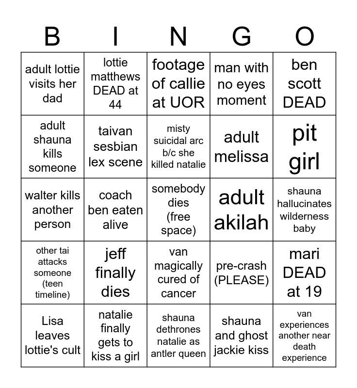 This bingo card has a free space and 24 words: jeff finally dies, natalie finally gets to kiss a girl, misty suicidal arc b/c she killed natalie, Lisa leaves lottie's cult, ben scott DEAD, adult lottie visits her dad, adult shauna kills someone, lottie matthews DEAD at 44, adult akilah, van magically cured of cancer, adult melissa, walter kills another person, pre-crash (PLEASE), mari DEAD at 19, taivan sesbian lex scene, shauna and ghost jackie kiss, shauna hallucinates wilderness baby, footage of callie at UOR, pit girl, coach ben eaten alive, van experiences another near death experience, other tai attacks someone (teen timeline), man with no eyes moment and shauna dethrones natalie as antler queen.
