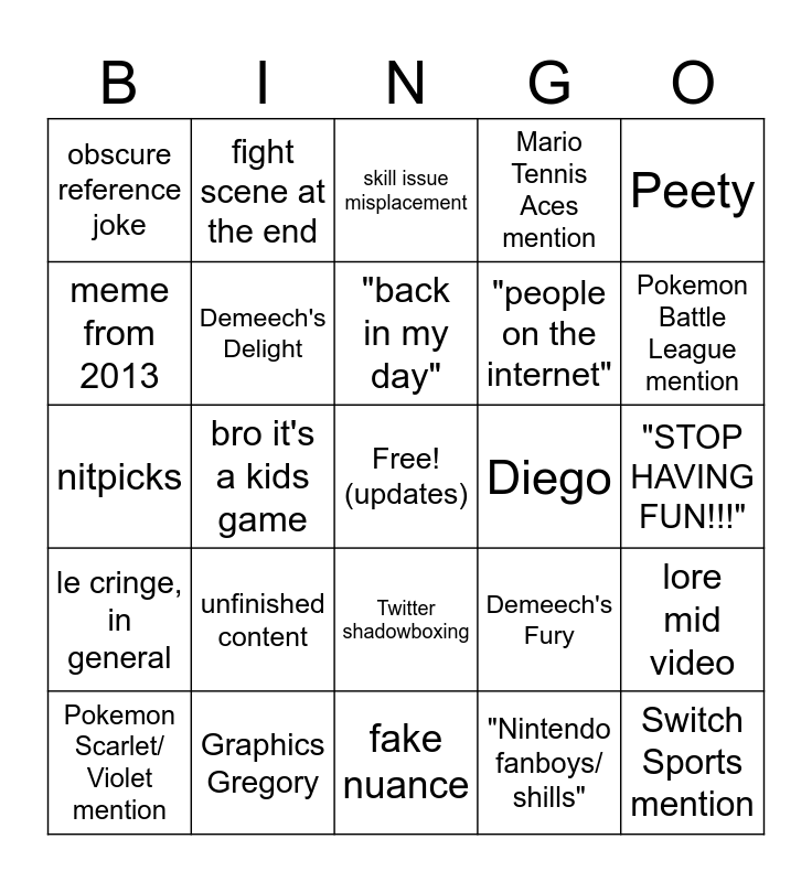 This bingo card has a free space and 24 words: unfinished content, Graphics Gregory, "back in my day", Pokemon Scarlet/ Violet mention, Peety, obscure reference joke, meme from 2013, fight scene at the end, Diego, Twitter shadowboxing, "people on the internet", nitpicks, Demeech's Fury, lore mid video, Demeech's Delight, "Nintendo fanboys/ shills", "STOP HAVING FUN!!!", skill issue misplacement, Pokemon Battle League mention, bro it's a kids game, Switch Sports mention, le cringe, in general, Mario Tennis Aces mention and fake nuance.