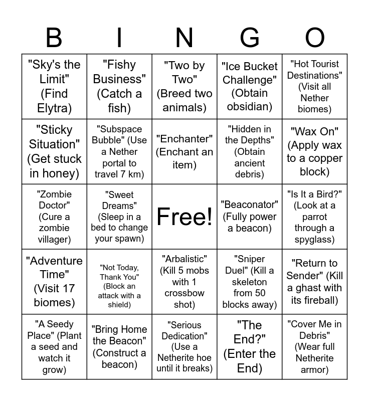 This bingo card has a free space and 24 words: "Not Today, Thank You" (Block an attack with a shield), "Bring Home the Beacon" (Construct a beacon), "Enchanter" (Enchant an item), "A Seedy Place" (Plant a seed and watch it grow), "Hot Tourist Destinations" (Visit all Nether biomes), "Sky's the Limit" (Find Elytra), "Sticky Situation" (Get stuck in honey), "Fishy Business" (Catch a fish), "Beaconator" (Fully power a beacon), "Arbalistic" (Kill 5 mobs with 1 crossbow shot), "Hidden in the Depths" (Obtain ancient debris), "Zombie Doctor" (Cure a zombie villager), "Sniper Duel" (Kill a skeleton from 50 blocks away), "Return to Sender" (Kill a ghast with its fireball), "Subspace Bubble" (Use a Nether portal to travel 7 km), "The End?" (Enter the End), "Is It a Bird?" (Look at a parrot through a spyglass), "Two by Two" (Breed two animals), "Wax On" (Apply wax to a copper block), "Sweet Dreams" (Sleep in a bed to change your spawn), "Cover Me in Debris" (Wear full Netherite armor), "Adventure Time" (Visit 17 biomes), "Ice Bucket Challenge" (Obtain obsidian) and "Serious Dedication" (Use a Netherite hoe until it breaks).