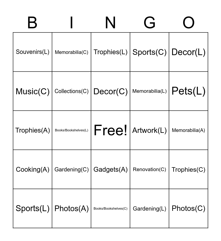 This bingo card has a free space and 51 words: Artwork(C), Photos(C), Decor(C), Books/Bookshelves(C), Gardening(C), Souvenirs(C), Memorabilia(C), Cooking(C), Music(C), Pets(C), Collections(C), Sports(C), Trophies(C), Renovation(C), Children(C), Gadgets(C), Decor(C), Artwork(L), Photos(L), Decor(L), Books/Bookshelves(L), Gardening(L), Souvenirs(L), Memorabilia(L), Cooking(L), Music(L), Pets(L), Collections(L), Sports(L), Trophies(L), Renovation(L), Children(L), Gadgets(L), Decor(L), Artwork(A), Photos(A), Decor(A), Books/Bookshelves(A), Gardening(A), Souvenirs(A), Memorabilia(A), Cooking(A), Music(A), Pets(A), Collections(A), Sports(A), Trophies(A), Renovation(A), Children(A), Gadgets(A) and Decor(A).