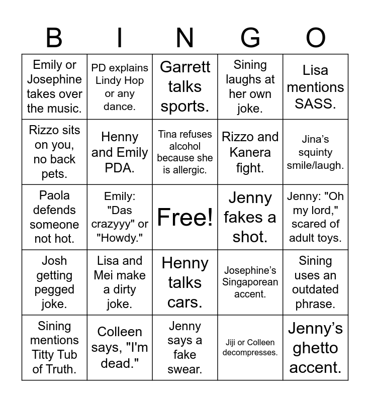 This bingo card has a free space and 30 words: Colleen says, "I'm dead.", Dogs start humping., Emily: "Das crazyyy" or "Howdy.", Emily justifies Rizzo’s behavior., Emily or Josephine takes over the music., Garrett talks sports., Henny and Emily PDA., Henny talks cars., Jenny fakes a shot., Jenny says a fake swear., Jenny: "Oh my lord," scared of adult toys., Jenny’s ghetto accent., Jiji or Colleen decompresses., Jina goes 1 hr+ without looking at her phone., Jina’s squinty smile/laugh., Josephine vapes., Josephine’s Singaporean accent., Josh getting pegged joke., Lisa and Mei make a dirty joke., Lisa mentions SASS., Paola defends someone not hot., Paola dotes on Jiji., PD explains Lindy Hop or any dance., Rizzo and Kanera fight., Rizzo sits on you, no back pets., Sining laughs at her own joke., Sining uses an outdated phrase., Sining mentions Titty Tub of Truth., Tina refuses alcohol because she is allergic. and "I already have this" (White Elephant)..