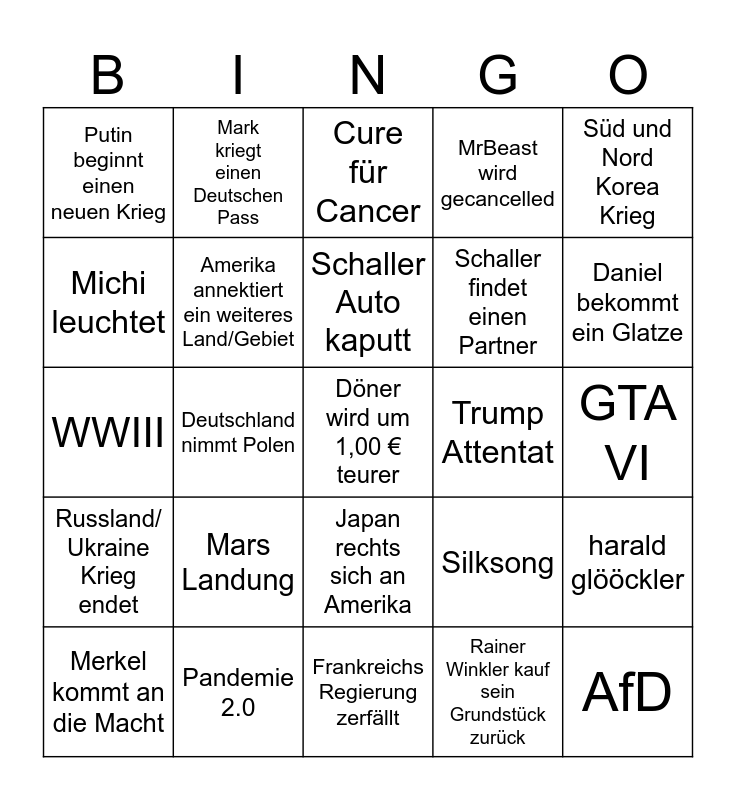 This bingo card has a free space and 24 words: Mars Landung, Pandemie 2.0, Schaller Auto kaputt, Merkel kommt an die Macht, Süd und Nord Korea Krieg, Putin beginnt einen neuen Krieg, Michi leuchtet, Mark kriegt einen Deutschen Pass, Trump Attentat, Japan rechts sich an Amerika, Schaller findet einen Partner, WWIII, Silksong, harald glööckler, Amerika annektiert ein weiteres Land/Gebiet, Rainer Winkler kauf sein Grundstück zurück, GTA VI, Cure für Cancer, Daniel bekommt ein Glatze, Deutschland nimmt Polen, AfD, Russland/ Ukraine Krieg endet, MrBeast wird gecancelled and Frankreichs Regierung zerfällt.