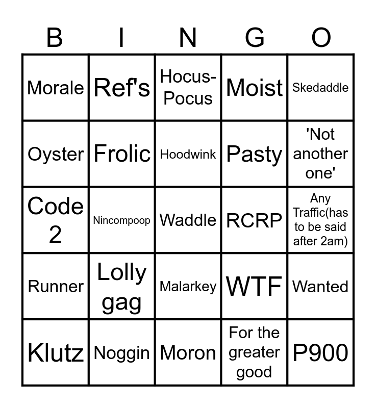 This bingo card has a free space and 24 words: Lolly gag, Noggin, Hoodwink, Klutz, Skedaddle, Morale, Oyster, Ref's, RCRP, Malarkey, Pasty, Code 2, WTF, Wanted, Frolic, For the greater good, Any Traffic(has to be said after 2am), Hocus-Pocus, 'Not another one', Nincompoop, P900, Runner, Moist and Moron.