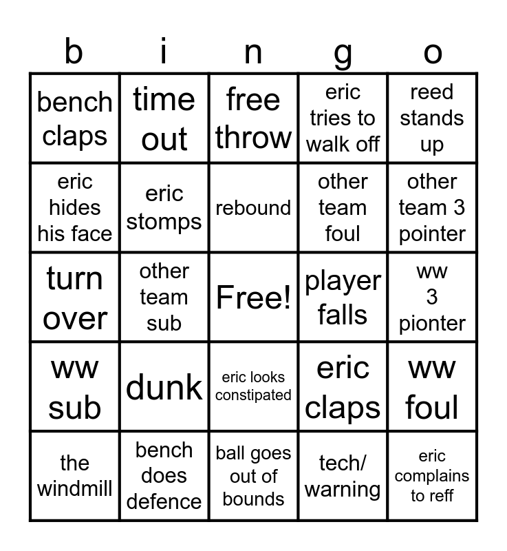 This bingo card has a free space and 24 words: the windmill, dunk, rebound, tech/ warning, reed stands up, bench claps, time out, free throw, player falls, ww 3 pionter, turn over, eric stomps, eric claps, ww foul, eric hides his face, bench does defence, ball goes out of bounds, eric tries to walk off, other team 3 pointer, ww sub, other team sub, eric looks constipated, other team foul and eric complains to reff.