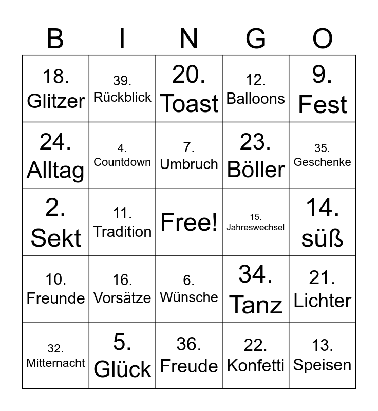 This bingo card has a free space and 40 words: 1. Feuerwerk, 2. Sekt, 3. Party, 4. Countdown, 5. Glück, 6. Wünsche, 7. Umbruch, 8. Neujahr, 9. Fest, 10. Freunde, 11. Tradition, 12. Balloons, 13. Speisen, 14. süß, 15. Jahreswechsel, 16. Vorsätze, 17. Feier, 18. Glitzer, 19. Singen, 20. Toast, 21. Lichter, 22. Konfetti, 23. Böller, 24. Alltag, 25. Familie, 26. Umarmung, 27. Neuanfang, 28. Resolution, 29. Stimmung, 30. Erinnerung, 31. Feuerzangenbowle, 32. Mitternacht, 33. Fackeln, 34. Tanz, 35. Geschenke, 36. Freude, 37. Besinnlichkeit, 38. Dekoration, 39. Rückblick and 40. Neujahrsgrüße.