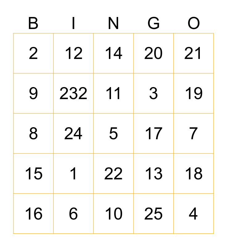 This bingo card has 25 words: 1, 10, 11, 16, 21, 2, 9, 12, 17, 22, 3, 8, 13, 18, 232, 4, 7, 14, 19, 24, 5, 6, 15, 20 and 25.