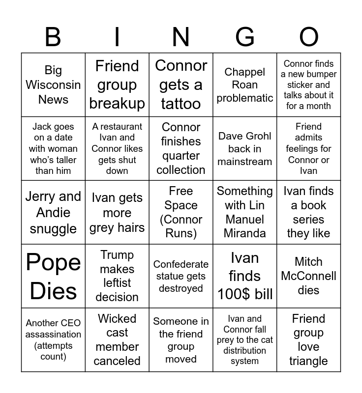 This bingo card has a free space and 24 words: Trump makes leftist decision, Wicked cast member canceled, Connor finishes quarter collection, Another CEO assassination (attempts count), Connor finds a new bumper sticker and talks about it for a month, Big Wisconsin News, Jack goes on a date with woman who’s taller than him, Friend group breakup, Something with Lin Manuel Miranda, Confederate statue gets destroyed, Dave Grohl back in mainstream, Jerry and Andie snuggle, Ivan finds 100$ bill, Mitch McConnell dies, A restaurant Ivan and Connor likes gets shut down, Ivan and Connor fall prey to the cat distribution system, Ivan finds a book series they like, Connor gets a tattoo, Friend admits feelings for Connor or Ivan, Ivan gets more grey hairs, Friend group love triangle, Pope Dies, Chappel Roan problematic and Someone in the friend group moved.