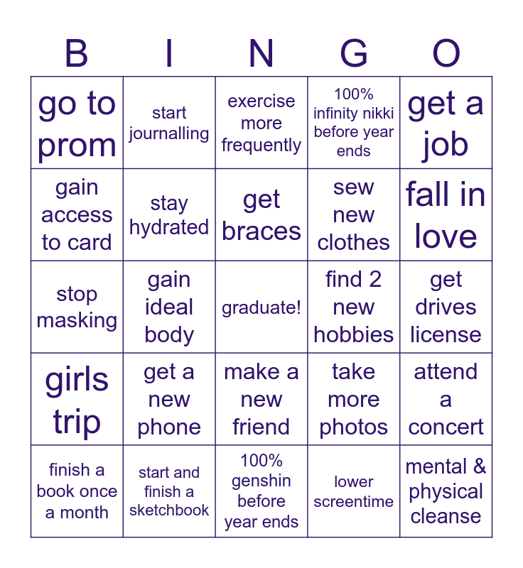This bingo card has a free space and 24 words: finish a book once a month, get a new phone, get braces, lower screentime, get a job, go to prom, start journalling, exercise more frequently, find 2 new hobbies, get drives license, stop masking, stay hydrated, take more photos, attend a concert, gain access to card, start and finish a sketchbook, 100% genshin before year ends, 100% infinity nikki before year ends, fall in love, girls trip, gain ideal body, make a new friend, sew new clothes and mental & physical cleanse.