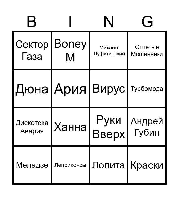 This bingo card has 41 words: Жуки, Руки Вверх, Иванушки, Вирус, Демо, Звери, Турбомода, Тату, Дюна, Краски, Андрей Губин, Отпетые Мошенники, Меладзе, Лолита, Леприконсы, Мираж, Кар-Мен, Сектор Газа, Мумий Тролль, Михаил Шуфутинский, Михаил Круг, Бутырка, Пропаганда, Дискотека Авария, Филипп Киркоров, Клава Кока, Niletto, Тимати, Ханна, Feduk, СССatch, Boney M, Кай Метов, Nirvana, Король и Шут, Ария, Panjabi MC, AC-DC, Алёна Апина, ACE of BASE and AQUA.