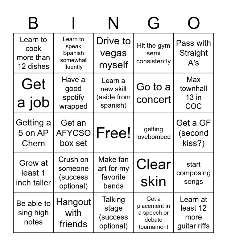 This bingo card has a free space and 24 words: Crush on someone (success optional), Hangout with friends, Learn a new skill (aside from spanish), Be able to sing high notes, Pass with Straight A's, Learn to cook more than 12 dishes, Get a job, Learn to speak Spanish somewhat fluently, getting lovebombed, Make fan art for my favorite bands, Go to a concert, Getting a 5 on AP Chem, Clear skin, start composing songs, Have a good spotify wrapped, Get a placement in a speech or debate tournament, Get a GF (second kiss?), Drive to vegas myself, Max townhall 13 in COC, Get an AFYCSO box set, Learn at least 12 more guitar riffs, Grow at least 1 inch taller, Hit the gym semi consistently and Talking stage (success optional).