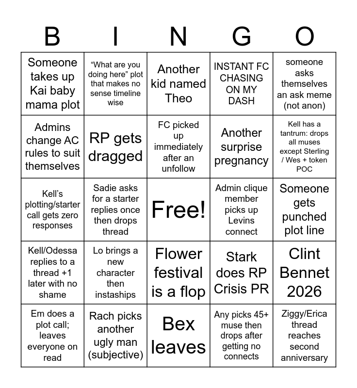 This bingo card has a free space and 24 words: Lo brings a new character then instaships, Rach picks another ugly man (subjective), FC picked up immediately after an unfollow, Em does a plot call; leaves everyone on read, someone asks themselves an ask meme (not anon), Someone takes up Kai baby mama plot, Admins change AC rules to suit themselves, “What are you doing here” plot that makes no sense timeline wise, Admin clique member picks up Levins connect, Flower festival is a flop, Another surprise pregnancy, Kell’s plotting/starter call gets zero responses, Stark does RP Crisis PR, Clint Bennet 2026, RP gets dragged, Any picks 45+ muse then drops after getting no connects, Someone gets punched plot line, Another kid named Theo, Kell has a tantrum: drops all muses except Sterling / Wes + token POC, Sadie asks for a starter replies once then drops thread, Ziggy/Erica thread reaches second anniversary, Kell/Odessa replies to a thread +1 later with no shame, INSTANT FC CHASING ON MY DASH and Bex leaves.