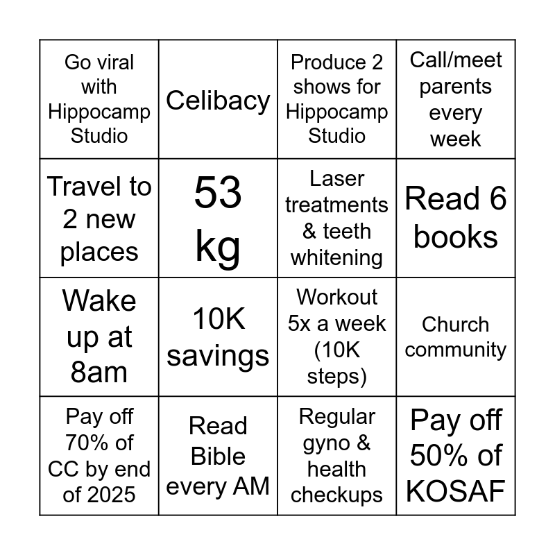 This bingo card has 16 words: Read Bible every AM, Church community, Produce 2 shows for Hippocamp Studio, Go viral with Hippocamp Studio, Wake up at 8am, Celibacy, Workout 5x a week (10K steps), Regular gyno & health checkups, Travel to 2 new places, 53 kg, Pay off 70% of CC by end of 2025, Call/meet parents every week, 10K savings, Read 6 books, Laser treatments & teeth whitening and Pay off 50% of KOSAF.