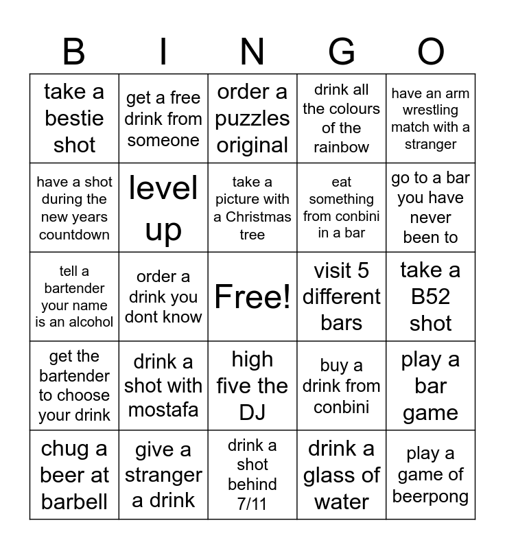 This bingo card has a free space and 24 words: drink a shot with mostafa, give a stranger a drink, take a picture with a Christmas tree, chug a beer at barbell, have an arm wrestling match with a stranger, take a bestie shot, have a shot during the new years countdown, get a free drink from someone, visit 5 different bars, high five the DJ, eat something from conbini in a bar, tell a bartender your name is an alcohol, buy a drink from conbini, play a bar game, level up, drink a glass of water, take a B52 shot, order a puzzles original, go to a bar you have never been to, order a drink you dont know, play a game of beerpong, get the bartender to choose your drink, drink all the colours of the rainbow and drink a shot behind 7/11.