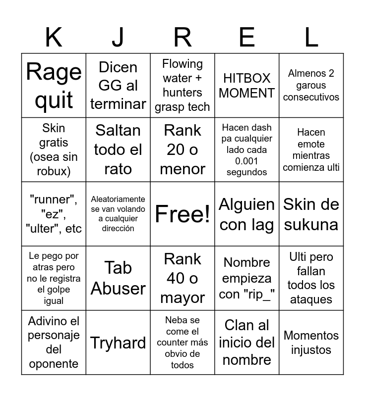 This bingo card has a free space and 24 words: Tab Abuser, Tryhard, Rank 20 o menor, Adivino el personaje del oponente, Almenos 2 garous consecutivos, Rage quit, Skin gratis (osea sin robux), Dicen GG al terminar, Alguien con lag, Rank 40 o mayor, Hacen dash pa cualquier lado cada 0.001 segundos, "runner", "ez", "ulter", etc, Nombre empieza con "rip_", Ulti pero fallan todos los ataques, Saltan todo el rato, Clan al inicio del nombre, Skin de sukuna, Flowing water + hunters grasp tech, Hacen emote mientras comienza ulti, Aleatoriamente se van volando a cualquier dirección, Momentos injustos, Le pego por atras pero no le registra el golpe igual, HITBOX MOMENT and Neba se come el counter más obvio de todos.
