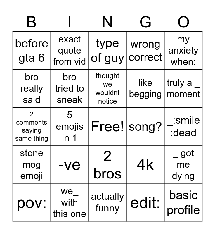 This bingo card has a free space and 24 words: -ve, we_ with this one, thought we wouldnt notice, pov:, my anxiety when:, before gta 6, bro really said, exact quote from vid, song?, 2 bros, like begging, 2 comments saying same thing, 4k, _ got me dying, bro tried to sneak, edit:, _:smile :dead, type of guy, truly a _ moment, 5 emojis in 1, basic profile, stone mog emoji, wrong correct and actually funny.