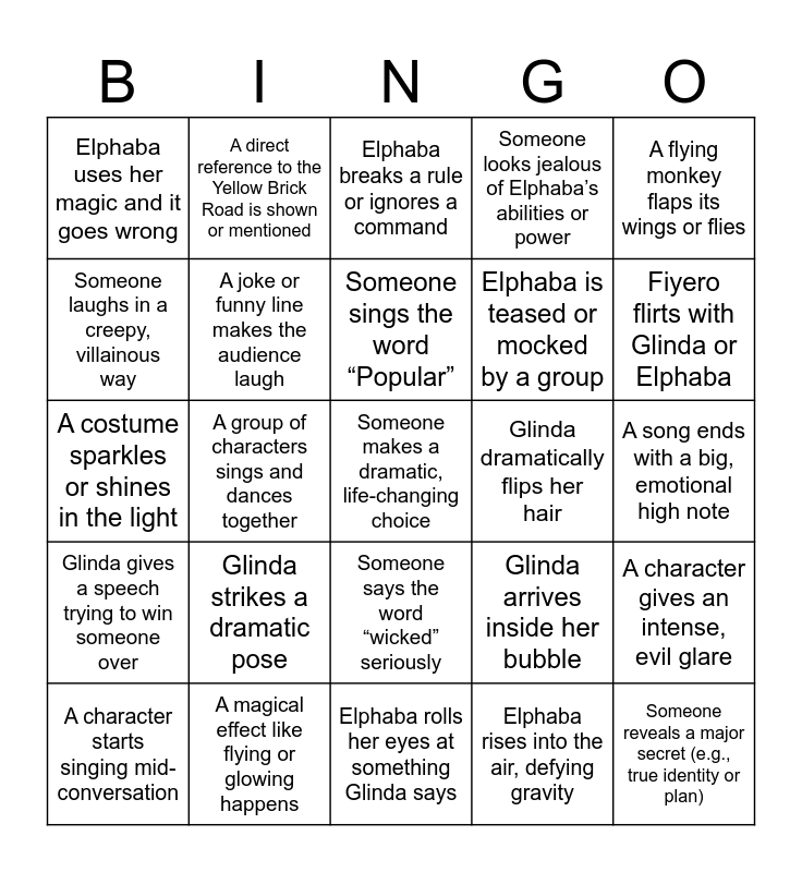 This bingo card has 25 words: Glinda strikes a dramatic pose, Elphaba rolls her eyes at something Glinda says, Someone sings the word “Popular”, A character starts singing mid-conversation, A flying monkey flaps its wings or flies, Elphaba uses her magic and it goes wrong, Someone laughs in a creepy, villainous way, A direct reference to the Yellow Brick Road is shown or mentioned, Glinda dramatically flips her hair, Someone says the word “wicked” seriously, Elphaba is teased or mocked by a group, A costume sparkles or shines in the light, Glinda arrives inside her bubble, A character gives an intense, evil glare, A joke or funny line makes the audience laugh, Someone reveals a major secret (e.g., true identity or plan), A song ends with a big, emotional high note, Elphaba breaks a rule or ignores a command, Fiyero flirts with Glinda or Elphaba, A group of characters sings and dances together, Someone makes a dramatic, life-changing choice, A magical effect like flying or glowing happens, Glinda gives a speech trying to win someone over, Someone looks jealous of Elphaba’s abilities or power and Elphaba rises into the air, defying gravity.