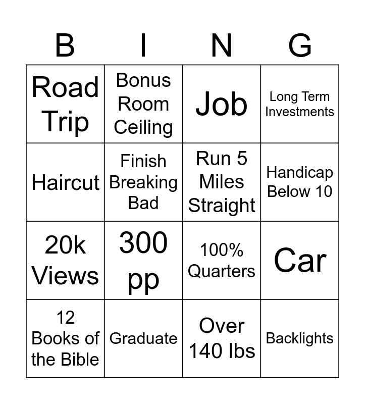 This bingo card has 16 words: Graduate, Car, Job, Road Trip, 20k Views, Bonus Room Ceiling, 100% Quarters, Over 140 lbs, Haircut, Finish Breaking Bad, 12 Books of the Bible, Long Term Investments, 300 pp, Handicap Below 10, Run 5 Miles Straight and Backlights.