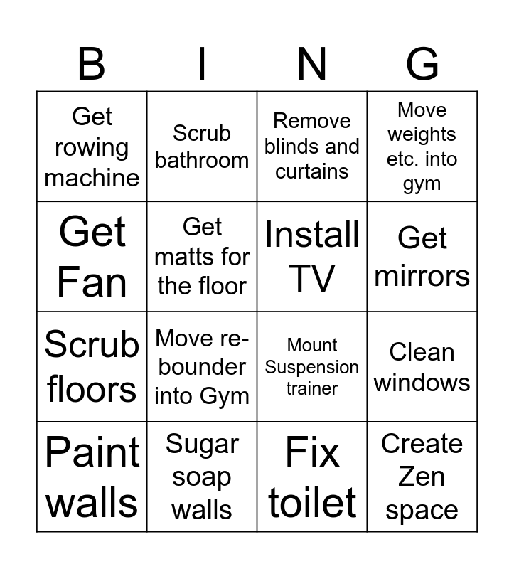 This bingo card has 16 words: Sugar soap walls, Clean windows, Remove blinds and curtains, Get rowing machine, Scrub floors, Scrub bathroom, Mount Suspension trainer, Fix toilet, Get Fan, Get matts for the floor, Paint walls, Move weights etc. into gym, Move re-bounder into Gym, Get mirrors, Install TV and Create Zen space.