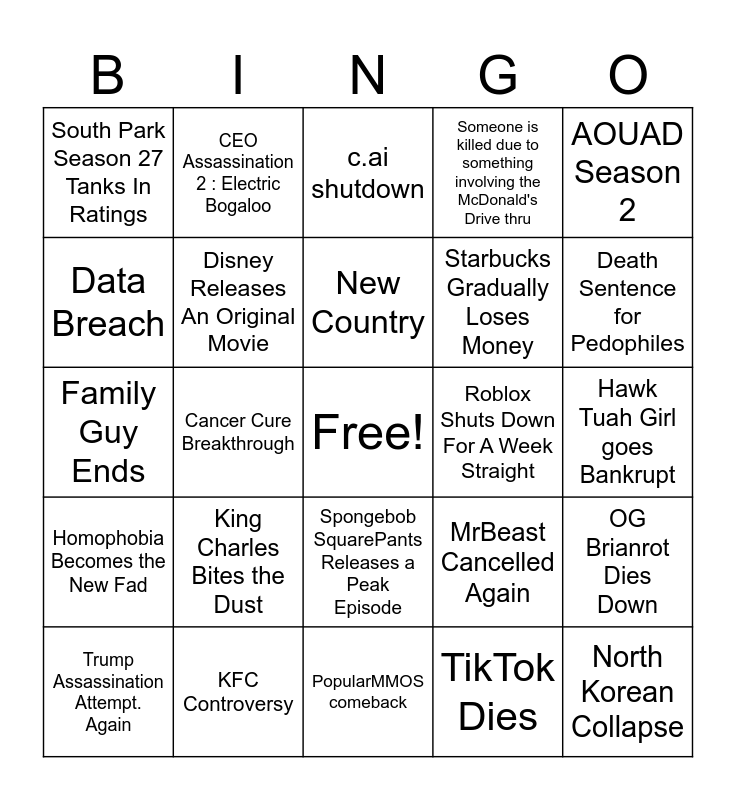 This bingo card has a free space and 24 words: Trump Assassination Attempt. Again, King Charles Bites the Dust, New Country, TikTok Dies, AOUAD Season 2, South Park Season 27 Tanks In Ratings, CEO Assassination 2 : Electric Bogaloo, c.ai shutdown, Roblox Shuts Down For A Week Straight, Hawk Tuah Girl goes Bankrupt, Family Guy Ends, Disney Releases An Original Movie, MrBeast Cancelled Again, OG Brianrot Dies Down, Data Breach, KFC Controversy, PopularMMOS comeback, Someone is killed due to something involving the McDonald's Drive thru, Death Sentence for Pedophiles, Homophobia Becomes the New Fad, Cancer Cure Breakthrough, Spongebob SquarePants Releases a Peak Episode, Starbucks Gradually Loses Money and North Korean Collapse.