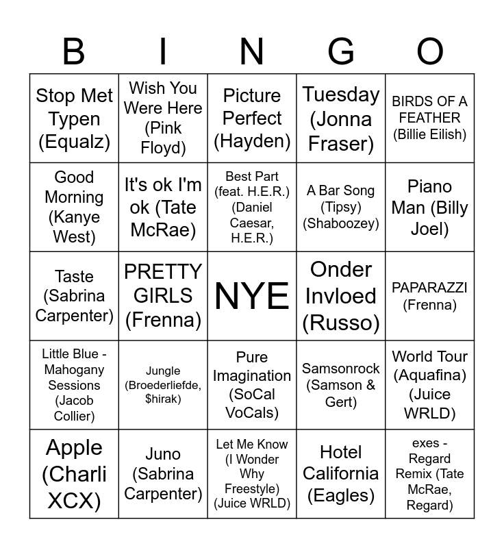 This bingo card has a free space and 41 words: Espresso (Sabrina Carpenter), Taste (Sabrina Carpenter), girl i've always been (Olivia Rodrigo), It's ok I'm ok (Tate McRae), Juno (Sabrina Carpenter), Pure Imagination (SoCal VoCals), Best Part (feat. H.E.R.) (Daniel Caesar, H.E.R.), Why Don't You Want Me (James Smith, Eloise), BIRDS OF A FEATHER (Billie Eilish), Little Blue - Mahogany Sessions (Jacob Collier), PRETTY GIRLS (Frenna), Tuesday (Jonna Fraser), exes - Regard Remix (Tate McRae, Regard), PAPARAZZI (Frenna), Onder Invloed (Russo), Jungle (Broederliefde, $hirak), Zulke Dingen Doe Je (I am Aisha, Dio), Stop Met Typen (Equalz), Mi No Lob (Broederliefde), Picture Perfect (Hayden), World Tour (Aquafina) (Juice WRLD), Lightyears (with Young Thug) (Juice WRLD, Young Thug), Let Me Know (I Wonder Why Freestyle) (Juice WRLD), A Bar Song (Tipsy) (Shaboozey), Bohemian Rhapsody - Remastered 2011 (Queen), Fix You (Coldplay), Hotel California (Eagles), Roller Coaster (Danny Vera), Piano Man (Billy Joel), A Whiter Shade of Pale - 2007 Remaster (Procol Harum), Stairway to Heaven - Remaster (Led Zeppelin), Wish You Were Here (Pink Floyd), Apple (Charli XCX), Vlinders (Brainpower, Dicecream), Samsonrock (Samson & Gert), Good Morning (Kanye West), 18 Plus (Afro Bros, Finest Sno), Happy New Year (ABBA), New Year's Day (Taylor Swift), Cooped Up / Return Of The Mack (Post Malone, Mark Morrison, Sickick) and Alaka (Broederliefde, Kalibwoy, SBMG).
