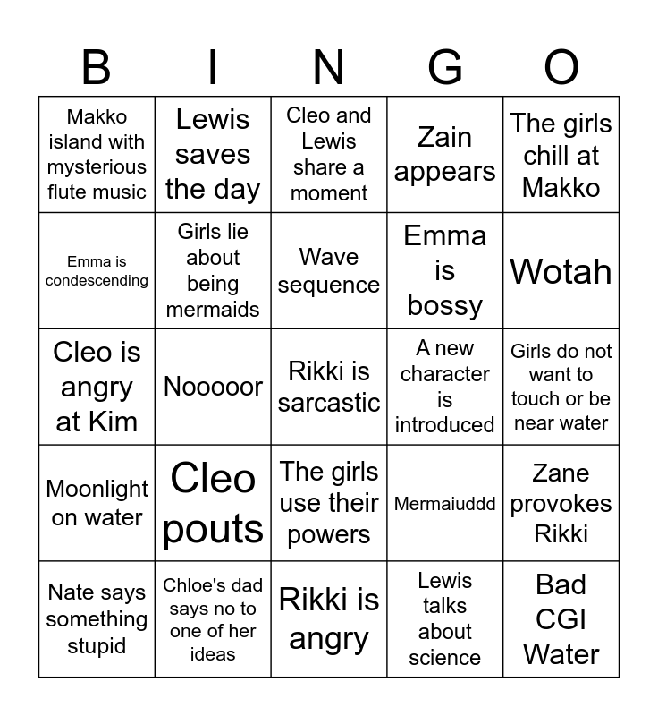 This bingo card has 25 words: Cleo pouts, Rikki is angry, Wave sequence, Nate says something stupid, The girls chill at Makko, Makko island with mysterious flute music, Emma is condescending, Lewis saves the day, A new character is introduced, The girls use their powers, Emma is bossy, Cleo is angry at Kim, Mermaiuddd, Zane provokes Rikki, Girls lie about being mermaids, Bad CGI Water, Girls do not want to touch or be near water, Cleo and Lewis share a moment, Wotah, Nooooor, Rikki is sarcastic, Chloe's dad says no to one of her ideas, Moonlight on water, Zain appears and Lewis talks about science.