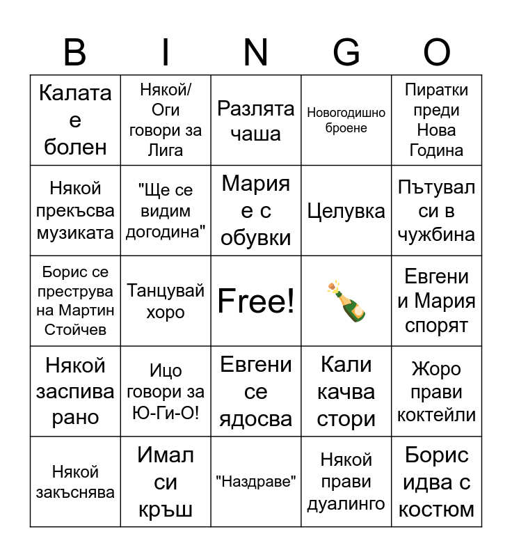 This bingo card has a free space and 34 words: Борис говори за аудито, Някой прави дуалинго, Ангел е изпил поне 3 енергийни, Жоро говори за войната, Някой заспива рано, "Ще се видим догодина", Пиратки преди Нова Година, Някой закъснява, Някой/Оги говори за Лига, Мария се снима, Мария е с обувки, Разлята чаша, Ицо говори за залагане, Неочаквани гости, 🍾, Пътувал си в чужбина, Имал си кръш, Борис се преструва на Мартин Стойчев, Ицо говори за Ю-Ги-О!, Кали качва стори, Евгени се ядосва, Февзи говори за фитнес, Калата е болен, Евгени и Мария спорят, "Наздраве", Борис идва с костюм, Новогодишно броене, Оги и Борис говорят за коли, Целувка, Някой прекъсва музиката, Ини реве, Танцувай хоро, Жоро прави коктейли and Ангел говори з обувки.