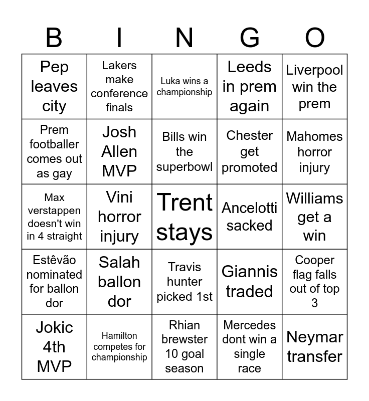 This bingo card has a free space and 24 words: Salah ballon dor, Hamilton competes for championship, Bills win the superbowl, Jokic 4th MVP, Liverpool win the prem, Pep leaves city, Prem footballer comes out as gay, Lakers make conference finals, Ancelotti sacked, Travis hunter picked 1st, Chester get promoted, Max verstappen doesn't win in 4 straight, Giannis traded, Cooper flag falls out of top 3, Josh Allen MVP, Mercedes dont win a single race, Williams get a win, Luka wins a championship, Mahomes horror injury, Vini horror injury, Neymar transfer, Estêvão nominated for ballon dor, Leeds in prem again and Rhian brewster 10 goal season.