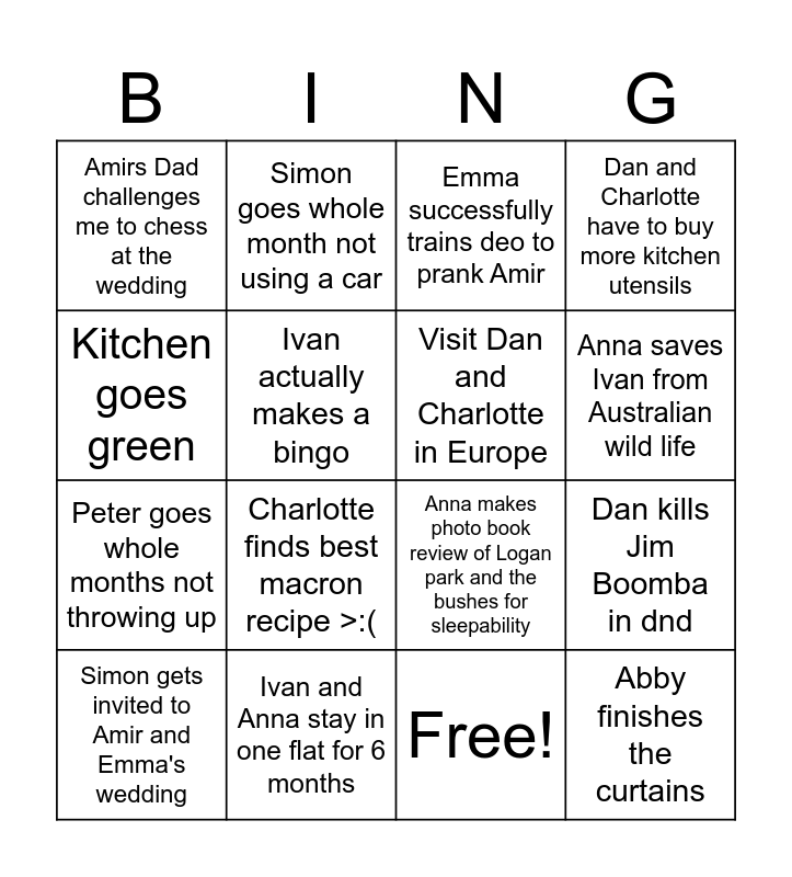 This bingo card has 17 words: Free!, Simon gets invited to Amir and Emma's wedding, Emma successfully trains deo to prank Amir, Amirs Dad challenges me to chess at the wedding, Charlotte finds best macron recipe >:(, Dan and Charlotte have to buy more kitchen utensils, Dan kills Jim Boomba in dnd, Visit Dan and Charlotte in Europe, Anna saves Ivan from Australian wild life, Ivan actually makes a bingo, Ivan and Anna stay in one flat for 6 months, Anna makes photo book review of Logan park and the bushes for sleepability, Kitchen goes green, Simon goes whole month not using a car, Peter goes whole months not throwing up, Special agent gingercrunch uses his litter box successfully for a whole month and Abby finishes the curtains.