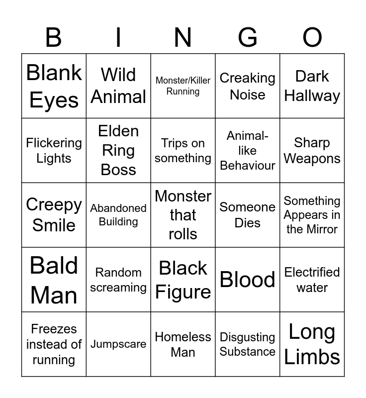 This bingo card has a free space and 24 words: Random screaming, Jumpscare, Trips on something, Freezes instead of running, Dark Hallway, Blank Eyes, Flickering Lights, Wild Animal, Someone Dies, Black Figure, Animal-like Behaviour, Creepy Smile, Blood, Electrified water, Elden Ring Boss, Disgusting Substance, Something Appears in the Mirror, Monster/Killer Running, Sharp Weapons, Abandoned Building, Long Limbs, Bald Man, Creaking Noise and Homeless Man.
