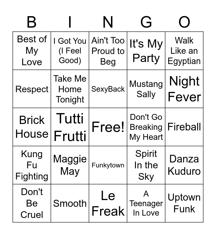 This bingo card has a free space and 29 words: Don't Be Cruel, Oh Pretty Woman, Tutti Frutti, Sh-Boom, Best of My Love, Ain't Too Proud to Beg, Take Me Home Tonight, Maggie May, Don't Go Breaking My Heart, Smooth, Fireball, Uptown Funk, Le Freak, A Teenager In Love, Night Fever, Billie Jean, Funkytown, Kung Fu Fighting, Walk Like an Egyptian, Brick House, Spirit In the Sky, Midnight Train to Georgia, Mustang Sally, Respect, It's My Party, I Got You (I Feel Good), Danza Kuduro, SexyBack and No Particular Place to Go.