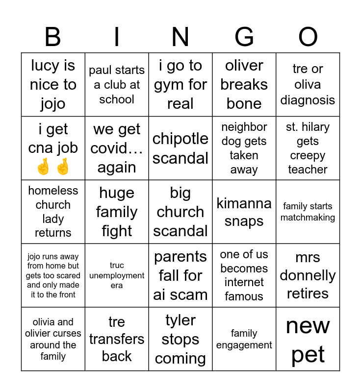 This bingo card has 25 words: truc unemployment era, tyler stops coming, chipotle scandal, olivia and olivier curses around the family, tre or oliva diagnosis, lucy is nice to jojo, i get cna job 🤞🤞, paul starts a club at school, kimanna snaps, parents fall for ai scam, neighbor dog gets taken away, homeless church lady returns, one of us becomes internet famous, mrs donnelly retires, we get covid… again, new pet, family starts matchmaking, i go to gym for real, st. hilary gets creepy teacher, huge family fight, big church scandal, tre transfers back, jojo runs away from home but gets too scared and only made it to the front, oliver breaks bone and family engagement.