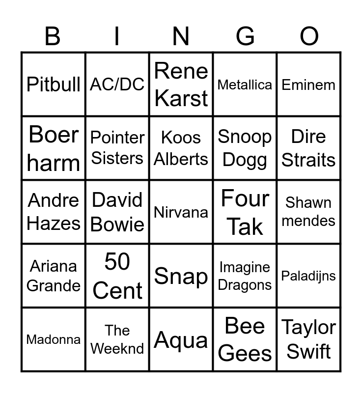 This bingo card has a free space and 64 words: Nena, Elvis Presley, Henk Wijngaard, Paladijns, The Police, Jan Smit, AC/DC, Black Eyed Peas, Koos Alberts, Vengaboys, Snap, Guns N' Roses, Shawn mendes, Eminem, Elton John, Boer harm, David Bowie, Pitbull, Bon Jovi, Snoop Dogg, 50 Cent, Ariana Grande, Metallica, David Guetta, TOTO, Michael Jackson, Bonnie Taylor, Queen, ABBA, Cyndi Lauper, Rick Astley, Bryan Adams, Rammstein, Kiss, Dire Straits, Madonna, Rolling Stones, Bee Gees, Boney .M, Pointer Sisters, Andre Hazes, Four Tak, Anita Berends, Wilma, Joost, Taylor Swift, The Weeknd, Dua Lipa, Imagine Dragons, UB40, Bob Marley, Donnie, Aqua, Normaal, Britney Spears, Billy Joel, Rene Karst, Guus Meeuwis, Tears For Fears, Iron Maiden, Wolfgang, Frans Bauer, OMD and Brunner & Brunner.