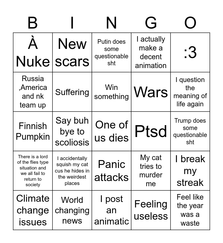 This bingo card has a free space and 24 words: I accidentally squish my cat cus he hides in the weirdest places, World changing news, Win something, Climate change issues, :3, À Nuke, Russia ,America and nk team up, New scars, Ptsd, Panic attacks, Wars, Finnish Pumpkin, My cat tries to murder me, I break my streak, Suffering, Feeling useless, Trump does some questionable sht, Putin does some questionable sht, I question the meaning of life again, Say buh bye to scoliosis, Feel like the year was a waste, There is a lord of the flies type situation and we all fail to return to society, I actually make a decent animation and I post an animatic.