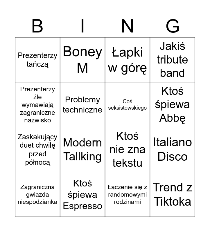This bingo card has 16 words: Ktoś śpiewa Espresso, Italiano Disco, Łapki w górę, Prezenterzy tańczą, Zaskakujący duet chwilę przed północą, Boney M, Ktoś nie zna tekstu, Łączenie się z randomowymi rodzinami, Prezenterzy źle wymawiają zagraniczne nazwisko, Problemy techniczne, Zagraniczna gwiazda niespodzianka, Jakiś tribute band, Modern Tallking, Ktoś śpiewa Abbę, Coś seksistowskiego and Trend z Tiktoka.
