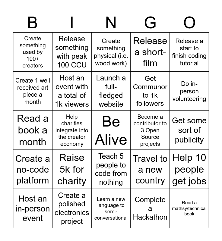 This bingo card has a free space and 24 words: Raise 5k for charity, Create a polished electronics project, Launch a full-fledged website, Host an in-person event, Release a start to finish coding tutorial, Create something used by 100+ creators, Create 1 well received art piece a month, Release something with peak 100 CCU, Become a contributor to 3 Open Source projects, Teach 5 people to code from nothing, Get Communor to 1k followers, Read a book a month, Travel to a new country, Help 10 people get jobs, Host an event with a total of 1k viewers, Complete a Hackathon, Get some sort of publicity, Create something physical (i.e. wood work), Do in-person volunteering, Help charities integrate into the creator economy, Read a mathsy/technical book, Create a no-code platform, Release a short-film and Learn a new language to semi-conversational.