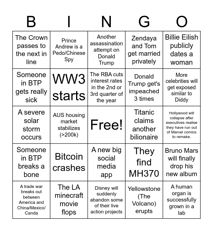 This bingo card has a free space and 24 words: Bitcoin crashes, The LA minecraft movie flops, The RBA cuts interest rates in the 2nd or 3rd quarter of the year, A trade war breaks out between America and China/Mexico/ Canda, Billie Eilish publicly dates a woman, The Crown passes to the next in line, Someone in BTP gets really sick, Prince Andrew is a Pedo/Chinese Spy, Titanic claims another bilionaire, A new big social media app, Donald Trump get's impeached 3 times, A severe solar storm occurs, They find MH370, Bruno Mars will finally drop his new album, WW3 starts, Yellowstone (The Volcano) erupts, Hollywood will collapse after executives realise they have run out of Marvel comics to remake., Another assassination attempt on Donald Trump, More celebrities will get exposed similar to Diddy, AUS housing market stabilizes (>200k), A human organ is successfully grown in a lab, Someone in BTP breaks a bone, Zendaya and Tom get married privately and Disney will suddenly abandon some of their live action projects.