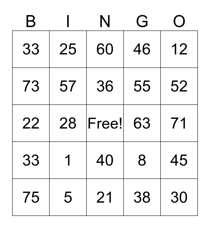 This bingo card has a free space and 24 words: 1, 5, 36, 75, 12, 33, 73, 25, 63, 40, 55, 22, 8, 45, 57, 38, 71, 60, 52, 28, 30, 33, 46 and 21.