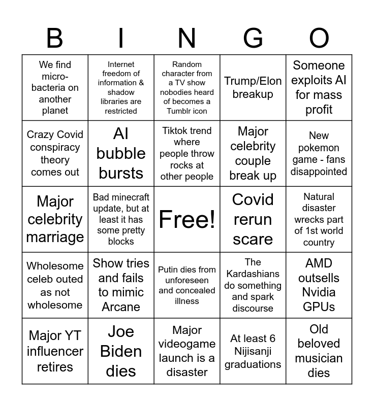 This bingo card has a free space and 24 words: Show tries and fails to mimic Arcane, Joe Biden dies, Tiktok trend where people throw rocks at other people, Major YT influencer retires, Someone exploits AI for mass profit, We find micro-bacteria on another planet, Crazy Covid conspiracy theory comes out, Internet freedom of information & shadow libraries are restricted, Covid rerun scare, Putin dies from unforeseen and concealed illness, Major celebrity couple break up, Major celebrity marriage, The Kardashians do something and spark discourse, AMD outsells Nvidia GPUs, AI bubble bursts, At least 6 Nijisanji graduations, Natural disaster wrecks part of 1st world country, Random character from a TV show nobodies heard of becomes a Tumblr icon, New pokemon game - fans disappointed, Bad minecraft update, but at least it has some pretty blocks, Old beloved musician dies, Wholesome celeb outed as not wholesome, Trump/Elon breakup and Major videogame launch is a disaster.