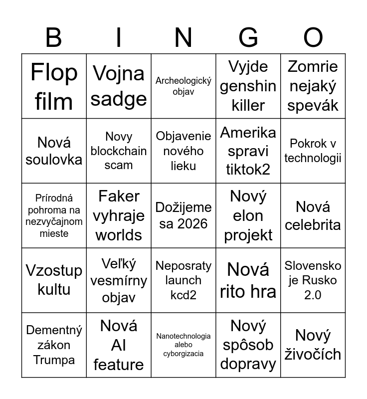 This bingo card has a free space and 24 words: Veľký vesmírny objav, Nová AI feature, Objavenie nového lieku, Dementný zákon Trumpa, Zomrie nejaký spevák, Flop film, Nová soulovka, Vojna sadge, Nový elon projekt, Neposraty launch kcd2, Amerika spravi tiktok2, Prírodná pohroma na nezvyčajnom mieste, Nová rito hra, Slovensko je Rusko 2.0, Novy blockchain scam, Nový spôsob dopravy, Nová celebrita, Archeologický objav, Pokrok v technologii, Faker vyhraje worlds, Nový živočích, Vzostup kultu, Vyjde genshin killer and Nanotechnologia alebo cyborgizacia.