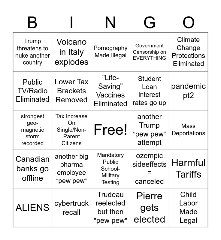 This bingo card has a free space and 24 words: another big pharma employee *pew pew*, cybertruck recall, "Life-Saving" Vaccines Eliminated, ALIENS, Climate Change Protections Eliminated, Trump threatens to nuke another country, Public TV/Radio Eliminated, Volcano in Italy explodes, another Trump *pew pew* attempt, Mandatory Public School-Military Testing, Student Loan interest rates go up, strongest geo-magnetic storm recorded, ozempic sideeffects = canceled, Harmful Tariffs, Lower Tax Brackets Removed, Pierre gets elected, Mass Deportations, Pornography Made Illegal, pandemic pt2, Tax Increase On Single/Non-Parent Citizens, Child Labor Made Legal, Canadian banks go offline, Government Censorship on EVERYTHING and Trudeau reelected but then *pew pew*.