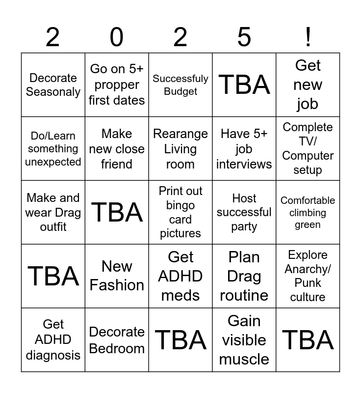 This bingo card has a free space and 24 words: New Fashion, Decorate Bedroom, Rearange Living room, Get ADHD diagnosis, Get new job, Decorate Seasonaly, Do/Learn something unexpected, Go on 5+ propper first dates, Host successful party, Get ADHD meds, Have 5+ job interviews, Make and wear Drag outfit, Plan Drag routine, Explore Anarchy/ Punk culture, Make new close friend, Gain visible muscle, Comfortable climbing green, Successfuly Budget, Complete TV/ Computer setup, TBA, TBA, TBA, TBA and TBA.