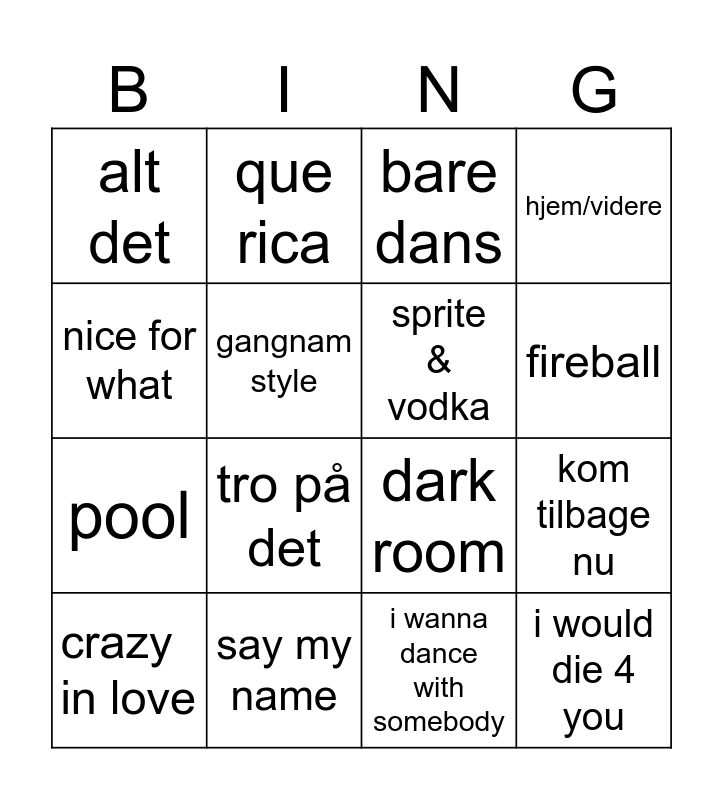 This bingo card has 16 words: crazy in love, say my name, bare dans, hjem/videre, nice for what, que rica, dark room, kom tilbage nu, alt det, gangnam style, i wanna dance with somebody, fireball, pool, tro på det, sprite & vodka and i would die 4 you.