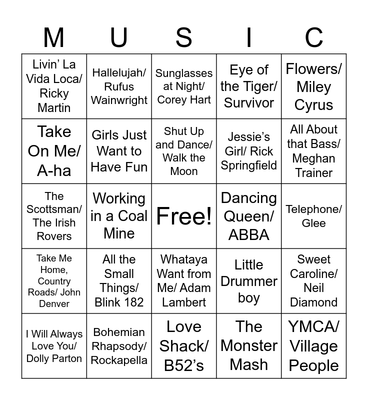 This bingo card has a free space and 62 words: Hotel California/ Eagles, Bohemian Rhapsody/ Rockapella, Piano Man/ Billy Joel, Take Me Home, Country Roads/ John Denver, Stairway to Heaven/ Led Zeppelin, Brown Eyed Girl/ Van Morrison, Girls Just Want to Have Fun, Billy Jean/ Michael Jackson, Jessie’s Girl/ Rick Springfield, Come On Eileen, Eye of the Tiger/ Survivor, Footloose/ Kenny Loggins, Take On Me/ A-ha, It’s All Coming Back to Me Now/ Celine Dion, Oops I Did It Again/ Britney Spears, Livin’ La Vida Loca/ Ricky Martin, YMCA/ Village People, Flowers/ Miley Cyrus, Shake It Off/ Taylor Swift, Shut Up and Dance/ Walk the Moon, Dancing Queen/ ABBA, Sunglasses at Night/ Corey Hart, I Will Always Love You/ Dolly Parton, The Monster Mash, I’m a Believer/ Smashmouth, Africa/ Toto, Crazy Thing Called Love/ Queen, You Spin Me Round/ Dead or Alive, Sweet Caroline/ Neil Diamond, American Pie/ Don McLean, Friends in Low Places/ Garth Brooks, Margarita-ville/ Jimmy Buffett, Lean on Me/ Bill Withers, Twist and Shout/ Chubby Checker, Telephone/ Glee, Hallelujah/ Rufus Wainwright, If I could turn back time/ Cher, Stacy’s Mom/ Fountains of Wayne, Working in a Coal Mine, Cecilia/ Simon & Garfunkle, The Scottsman/ The Irish Rovers, And then he Kissed me/ Crystals, All the Small Things/ Blink 182, One Love/ Bob Marley, All About that Bass/ Meghan Trainer, Little Drummer boy, Mama Mia/ Abba, The Greatest Showman, Texas Hold ‘Em – Beyonce, Zero – Imagine Dragons, Whataya Want from Me/ Adam Lambert, Love Shack/ B52’s, Pompeii/ Bastille, California Girls/ Beach Boys, Hang on Sloopy – OSU MB, Something Just Like This/ The Chainsmokers, I Would Walk 500 Miles/ The Proclaimers, Hokey Pokey, You’ll Be in My Heart/ Phil Collins, Kiss The Girl/ Little Mermaid, Jolene/ Dolly Parton and These Boots Are Made for Walking.