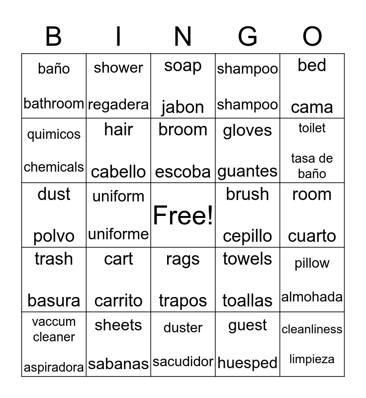 This bingo card has a free space and 24 words: cart carrito, sheets sabanas, broom escoba, vaccum cleaner aspiradora, bed cama, baño bathroom, quimicos chemicals, shower regadera, brush cepillo, rags trapos, gloves guantes, dust polvo, towels toallas, pillow almohada, hair cabello, guest huesped, room cuarto, soap jabon, toilet tasa de baño, uniform uniforme, cleanliness limpieza, trash basura, shampoo shampoo and duster sacudidor.