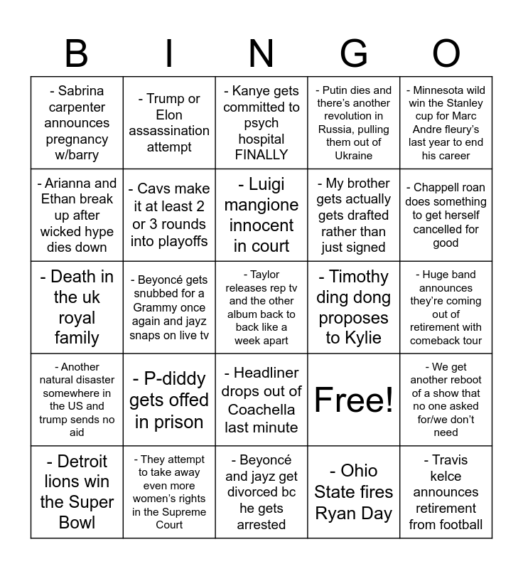 This bingo card has 25 words: - P-diddy gets offed in prison, - Beyoncé and jayz get divorced bc he gets arrested, - Luigi mangione innocent in court, - Detroit lions win the Super Bowl, - Minnesota wild win the Stanley cup for Marc Andre fleury’s last year to end his career, - Sabrina carpenter announces pregnancy w/barry, - Arianna and Ethan break up after wicked hype dies down, - Trump or Elon assassination attempt, - Timothy ding dong proposes to Kylie, - Headliner drops out of Coachella last minute, - My brother gets actually gets drafted rather than just signed, - Death in the uk royal family, Free!, - We get another reboot of a show that no one asked for/we don’t need, - Cavs make it at least 2 or 3 rounds into playoffs, - Travis kelce announces retirement from football, - Huge band announces they’re coming out of retirement with comeback tour, - Kanye gets committed to psych hospital FINALLY, - Chappell roan does something to get herself cancelled for good, - Beyoncé gets snubbed for a Grammy once again and jayz snaps on live tv, - Taylor releases rep tv and the other album back to back like a week apart, - They attempt to take away even more women’s rights in the Supreme Court, - Another natural disaster somewhere in the US and trump sends no aid, - Putin dies and there’s another revolution in Russia, pulling them out of Ukraine and - Ohio State fires Ryan Day.