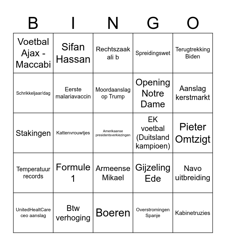 This bingo card has 48 words: Free!, Amerikaanse presidentsverkiezingen, Schoof, Boeren, Formule 1, Femke Bol, Sifan Hassan, Olympische spelen, Schrikkeljaar/dag, Aftreden koningin Denemarken, Eerste malariavaccin, Spreidingswet, Navo uitbreiding, Gijzeling Ede, Joost Klein / Songfestival, Zonsverduistering noord amerika, Moordaanslag op Trump, EK voetbal (Duitsland kampioen), CrowdStrike-incident 2024, Terugtrekking Biden, Kattenvrouwtjes, Overstromingen Spanje, Voetbal Ajax - Maccabi, Opening Notre Dame, Vlucht Assad, Aanslag kerstmarkt, UnitedHealtCare ceo aanslag, Krijgswet zuid korea, Armeense Mikael, Temperatuur records, Zelfmoordcapsule, Uitholling democratie, Vrouwenhaat / feminicide, Gisèle Pelicot, Btw verhoging, Desi bouterse, Asielcrisis, Pieter Omtzigt, Asfaltplakkers / a12 demonstratie, Wolfen, Fatbikes, Kabinetruzies, Rechtszaak ali b, Mike Tyson vs Jake Paul, Stakingen, Pensioen Youp van t Hek, Bitcoin and Elon Musk.